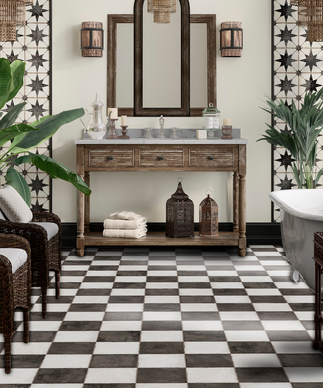 Elevate your space with this timeless 450x450 pre-corte tile featuring a classic black-and-white checkered pattern. The rustic finish adds a weathered charm, blending vintage aesthetics with modern design. Perfect for floors or walls, this tile brings a touch of character and sophistication to any room, effortlessly complementing both contemporary and traditional interiors. Durable, stylish, and easy to maintain, it’s an ideal choice for creating bold, unforgettable spaces.